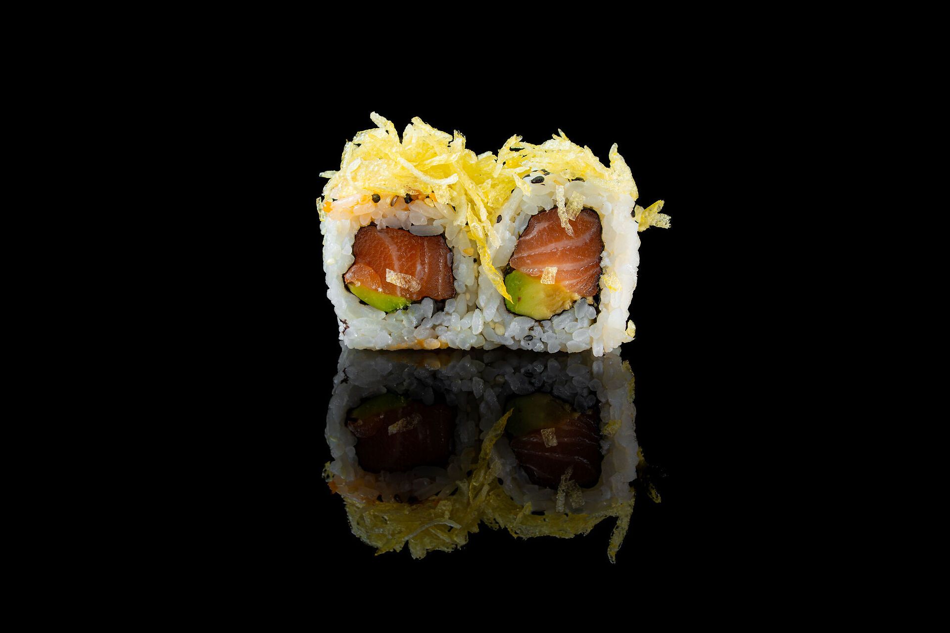 Salmone, avocado, patatine fritte, sesamo e pistacchio, sesamo e salsa Teriyaki