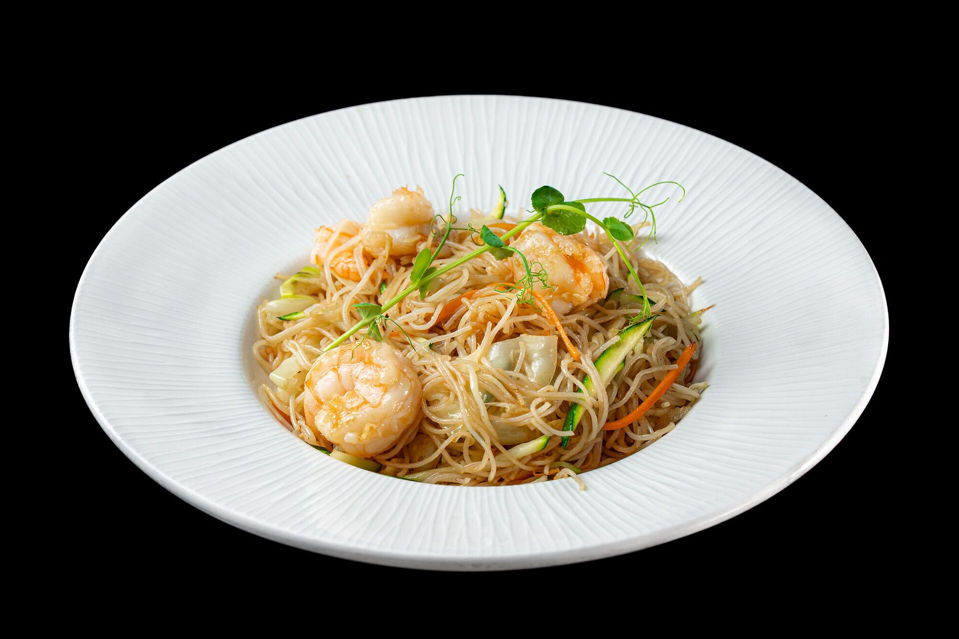 Spaghetti di riso con verdure miste, uovo e gamberi(mazzancolle)