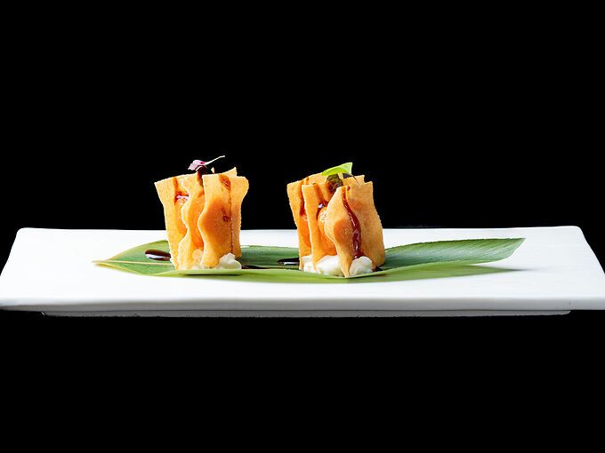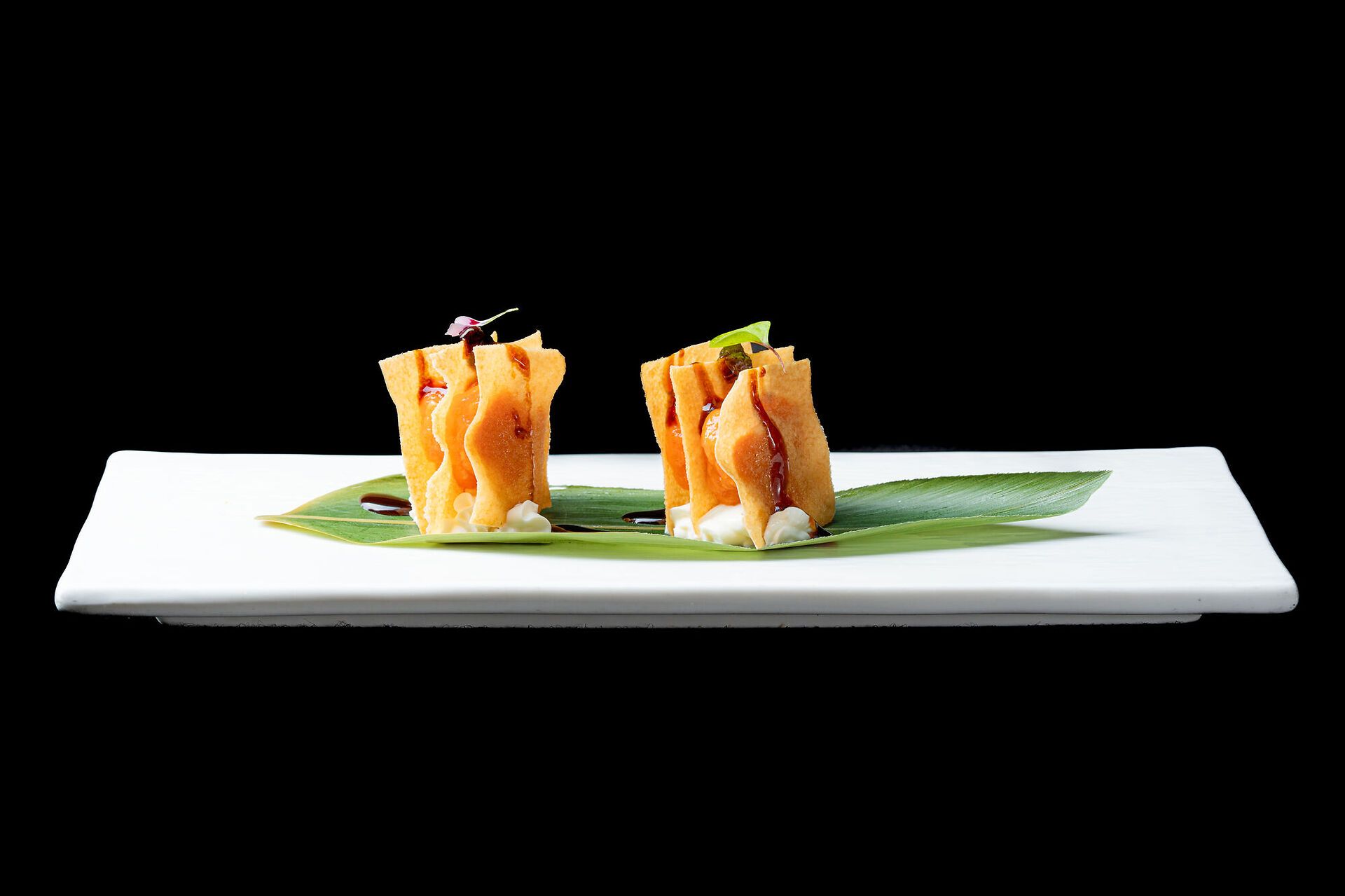 Involtino primavera con salmone crudo, philadelphia, tartufo e salsa teriyaki