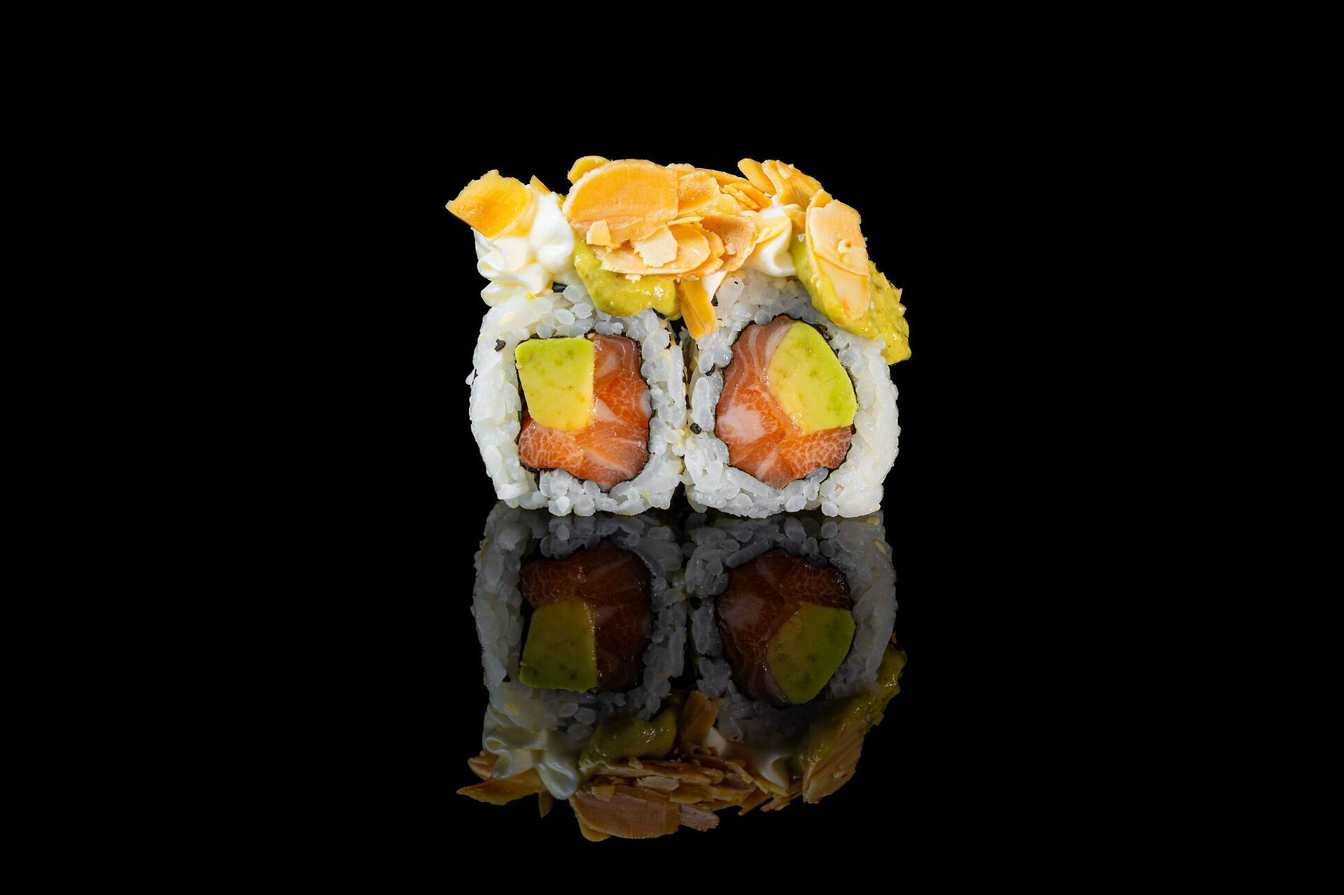 Salmone, avocado, philadelphia, mandorle, pistacchio, salso avocado e sesamo