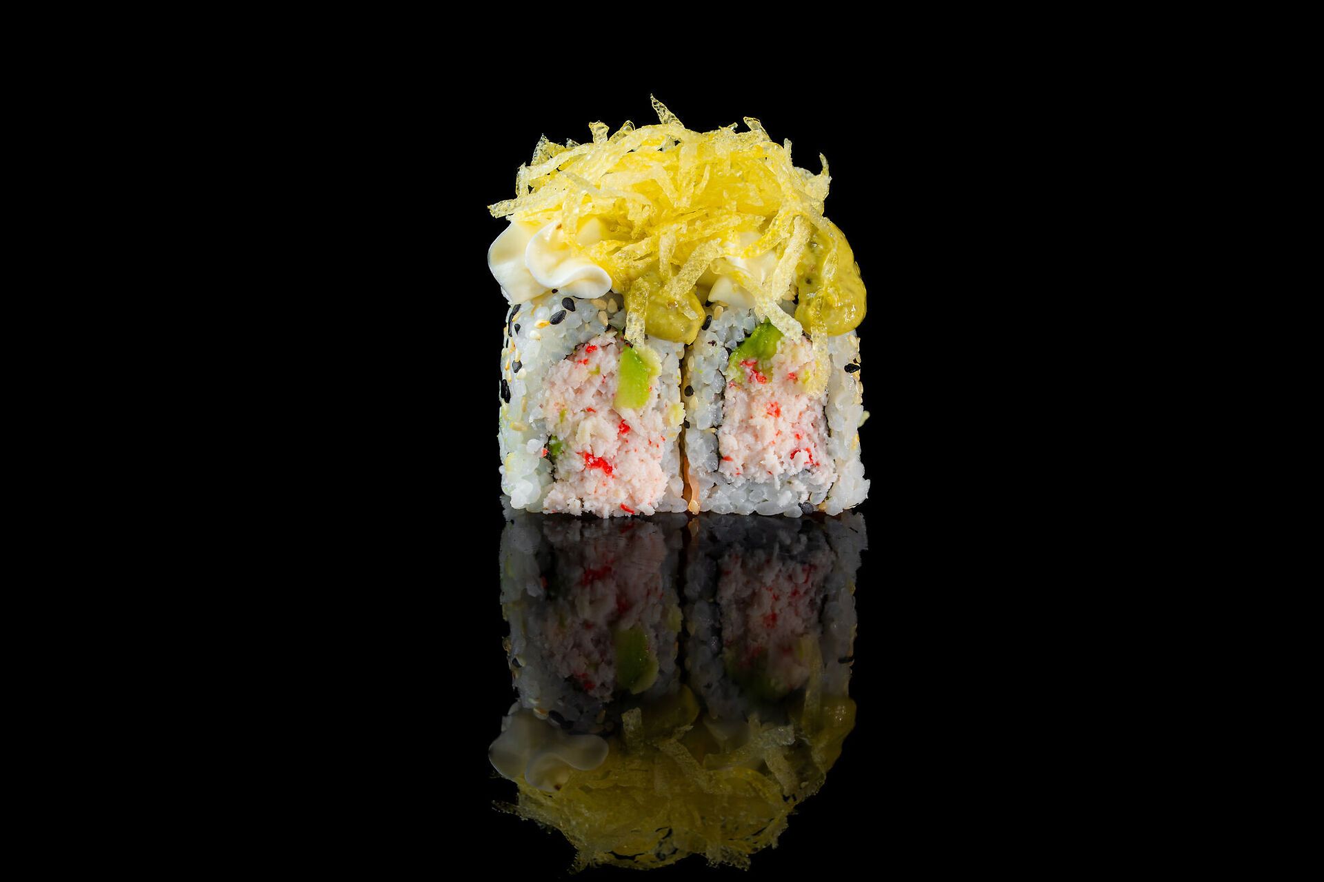 Surimi di granchio, philadelphia, avocado, salsa avocado, patatine fritte, sesamo