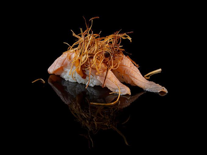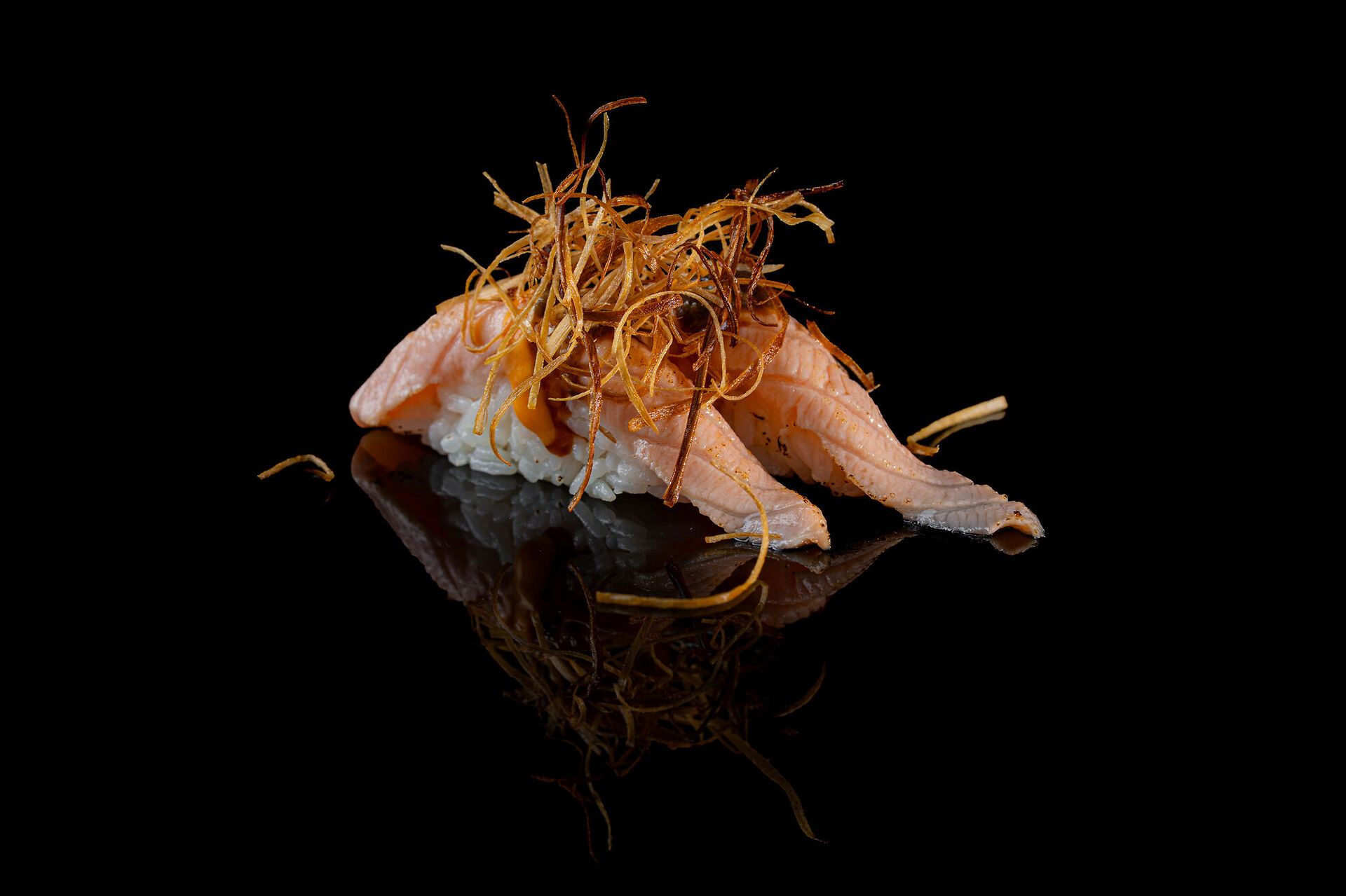 Salmone scottato con porri fry, salsa tartufo e salsa teriyaki