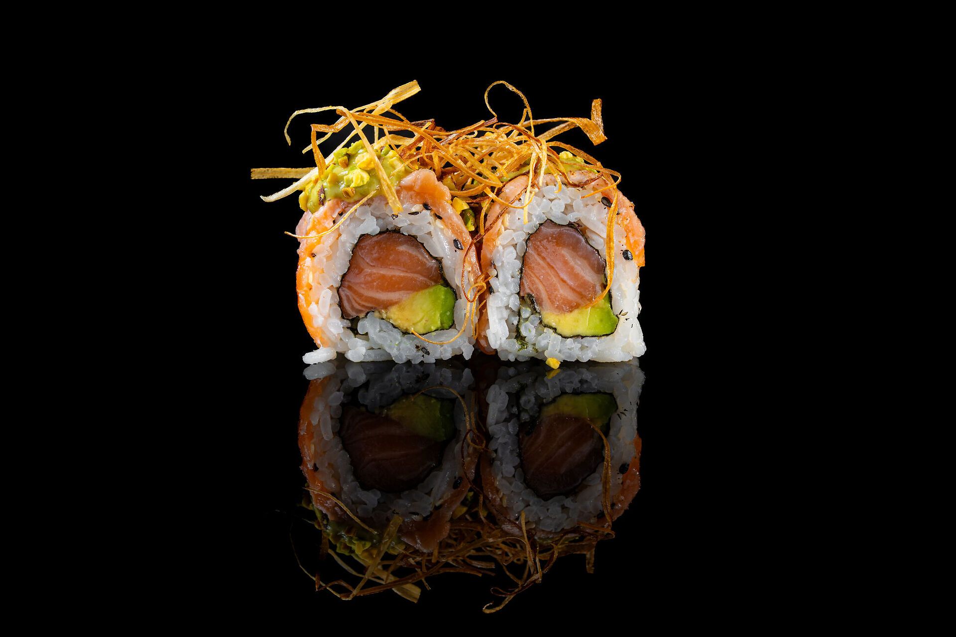 Salmone, salmone scottato, avocado, salsa avocado, pistachio e porri fritti