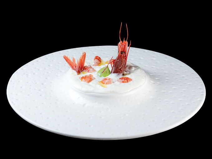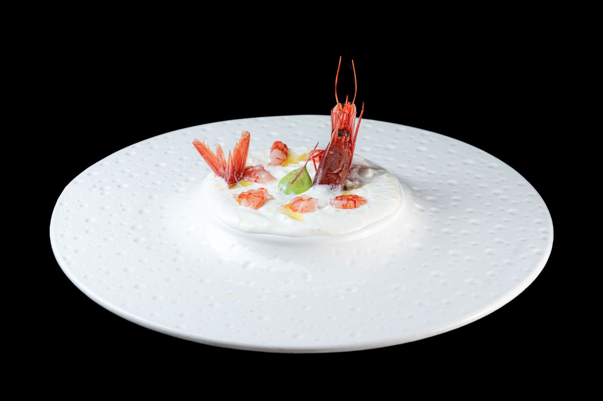 Stacciatella, gamberi rossi, pepe nero e olio d'oliva aromatizzato al basilico